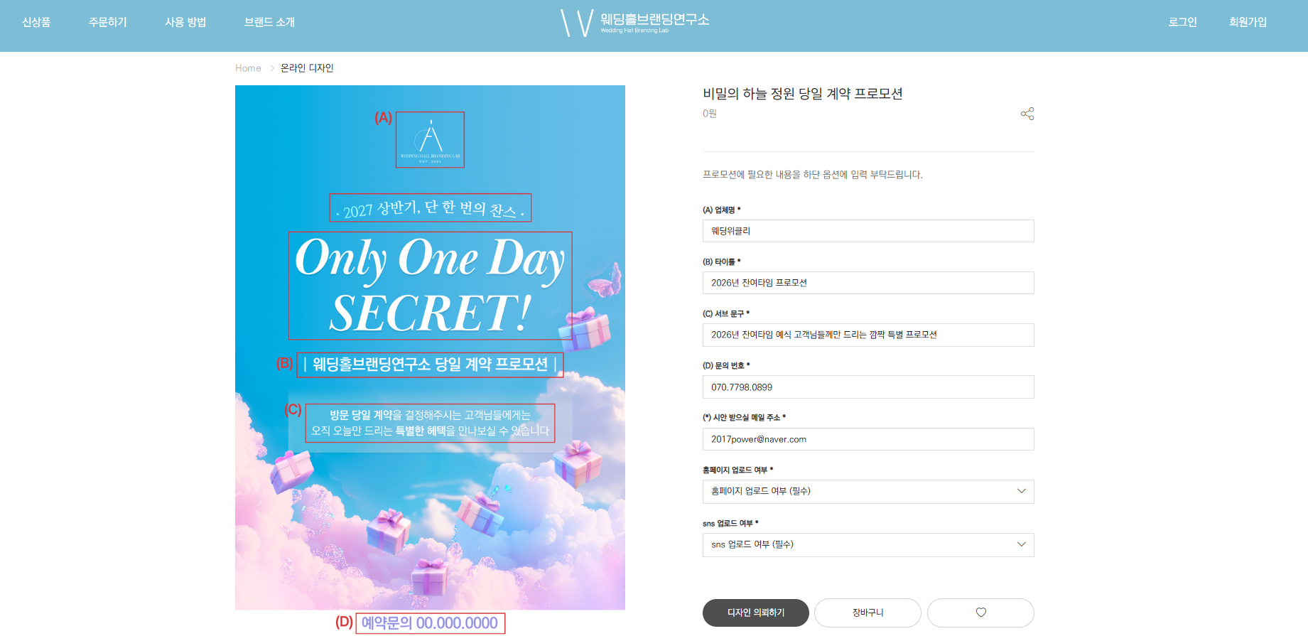 이미지 자료: 웨딩홀브랜딩연구소 당일 계약 프로모션을 잔여타임 프로모션으로 요청하고 있는 이미지